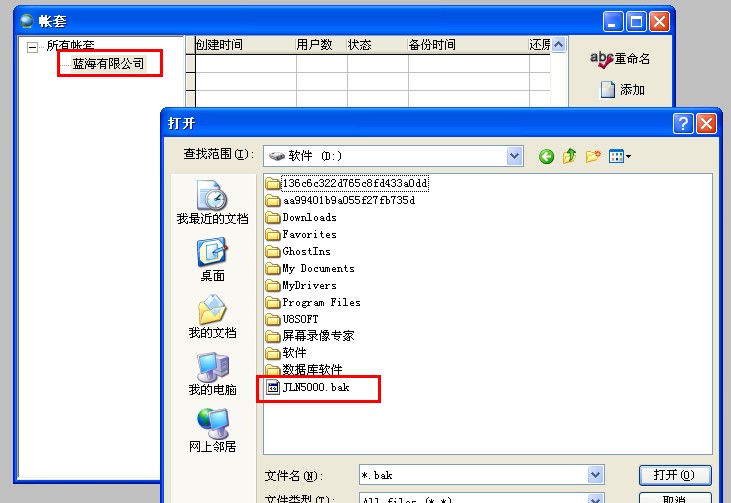 在B电脑上选择要导入的帐套,在目录中选择此帐套文件执行导入