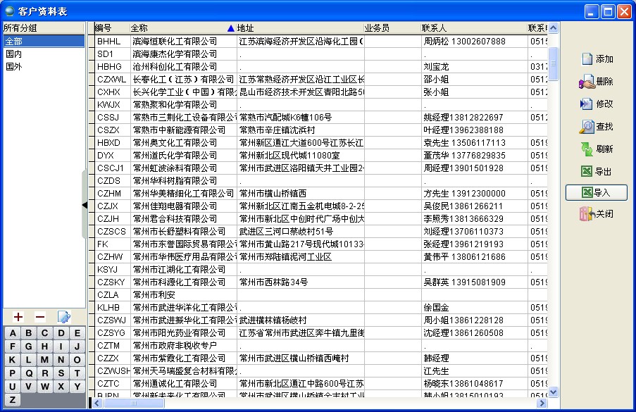 可以对客户进行分组管理,点击左下角字母按钮可快速查看客户信息。