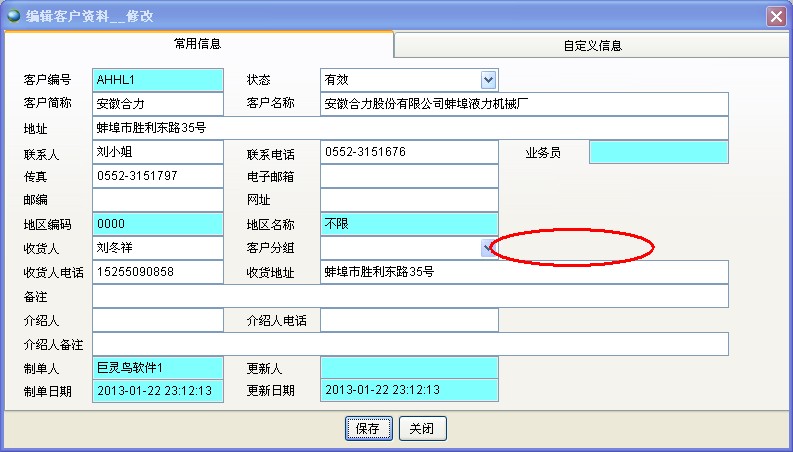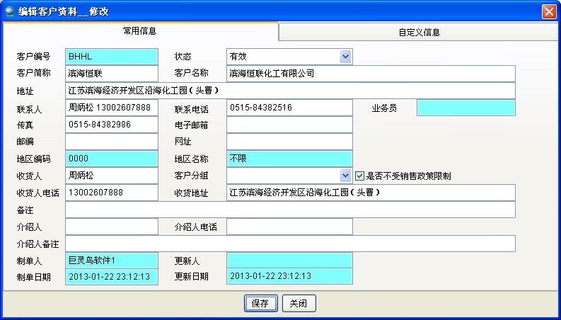 双击表格中的行可以进入客户资料详细信息。客户编号是无法修改的,如果该编号不再使用可以删除或失效。客户编号、供应商编号、部门编号是共用一套编码规则的,也就是说如果已有客户编号0001,则供应商编号、部门编号不能再使用0001这个编号。