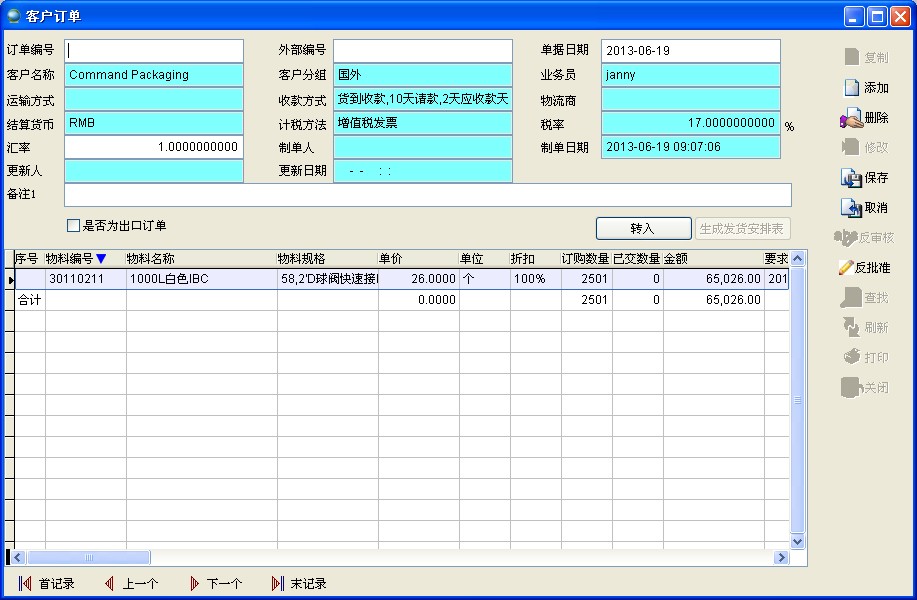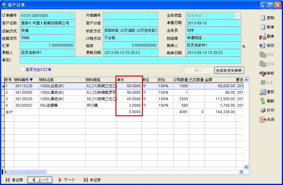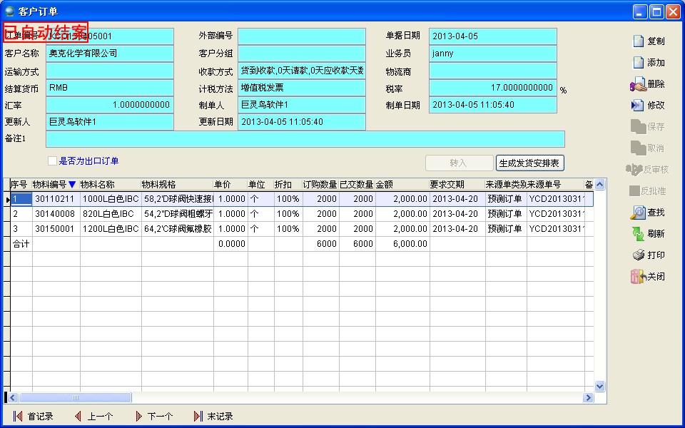 选择一个已有的客户订单,点击【复制】,除了订单编号和订单日期发生变化外其他订单信息都被复制到新订单,