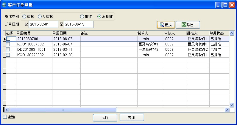 客户订单为两级审核,需经过审核、批准才能生效,可在每张订单中进行审批,也可批量审批。在【销售】->【客户订单】->【客户订单审批】
