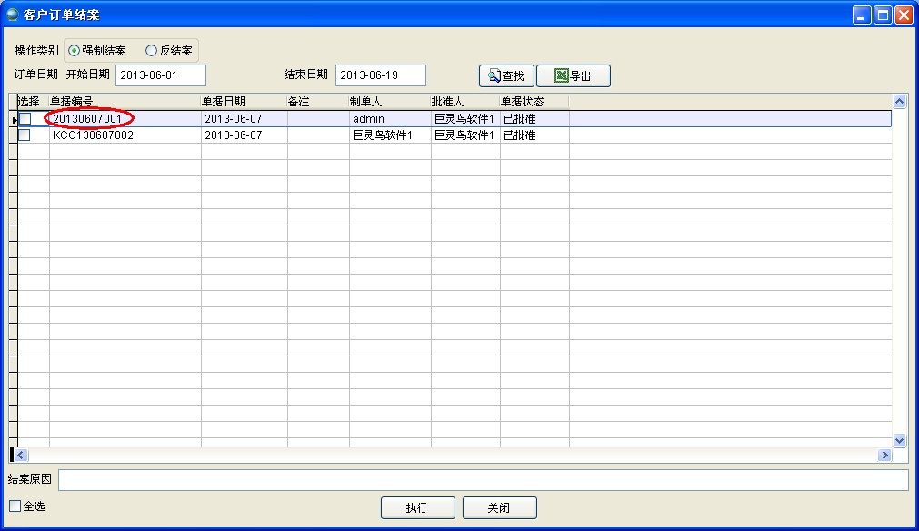 现在可以关闭此订单,不再继续执行。订单被强制结案后无法向下执行,如发货、收款等。对强制结案的订单需写明结案原因。