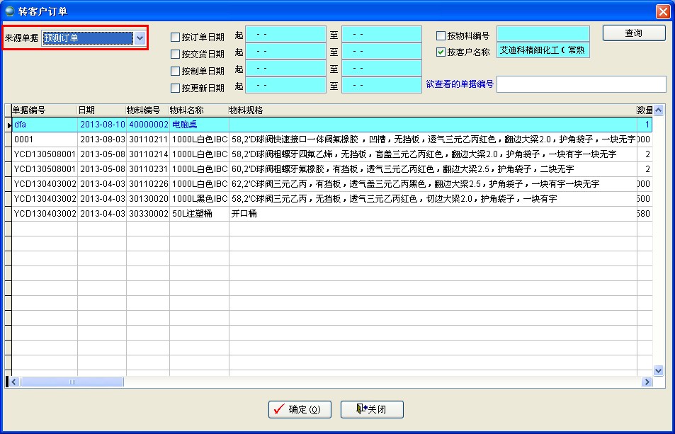 在客户订单中新建客户订单,选择客户后,点击【转入】可以依据预测订单生成客户订单。