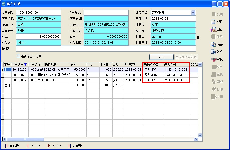 客户订单保存后可以看到来源单为预测订单