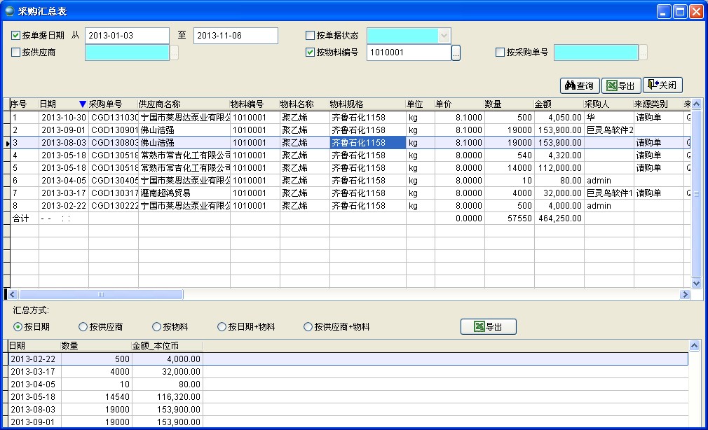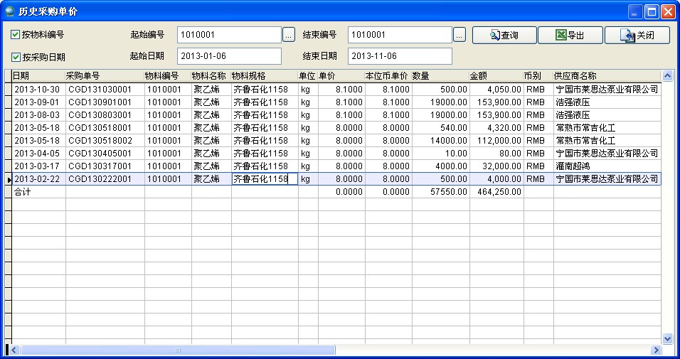 通过历史采购单价可以查询以往采购的价格,如下图,物料1010001采购单价8元和8.1元