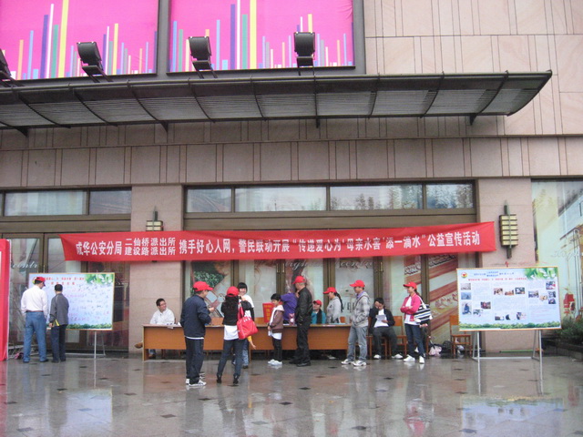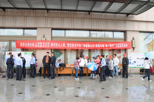 今天清晨,天空飘着绵绵细雨,微风吹拂,脸上掠过丝丝秋天的凉意,平日里热闹拥挤的建设路高地广场也显得有些冷冷清清,但是,远远望去,那里清晰跳动着一簇簇天蓝和星星点点的红色却是格外的耀眼夺目,走近一看,原来二仙桥派出所、建设路派出所的警察与好心人网的成员代表,经过半个多月的筹备http://www.goodpeople.net.cn/Show.asp?ID=1970&BoardID=53&TB=1,今天冒雨在这个举国欢庆的日子,警民联动正在开展“传递爱心,为‘母亲水窖’添一滴水”公益宣传活动: