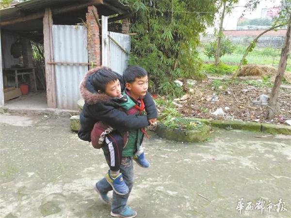 内江8岁幺叔背13岁残疾侄儿上学 风雨无阻
