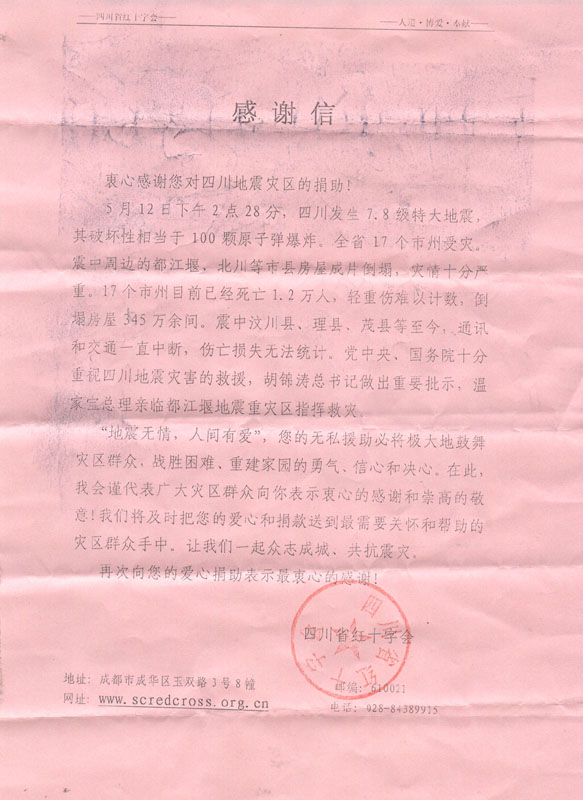 到现在家里还有崭新的幼童衣裤10多套,婴儿的连体衣6-7件,天凉一点时正好穿,过段时间我回家拿去给孩子们或者让家人现在送过去。地震那几天下雨,温度很低是可以穿秋装的。乡下的熟人亲戚们也都受了灾,也在尽力地帮助,拿钱拿物,接受投靠。对农村贫困的人我们一直都是几十年不断地拿钱出来支持,也要一直支持下去.我们都是从落后地区走出来的,知道那儿的艰辛。这次全国甚至全世界人民都在支援四川,我们非常感动,看到那么多外地的救援大军、救护车和各种物质进入城区驶向乡镇,心里充满感激.每天住在河堤上,白天夜晚时常有救援飞机从头顶掠过,有无数的救灾汽车从身边经过,飞机声、汽车声、警笛声交错不绝于耳,就象活在战争年代。