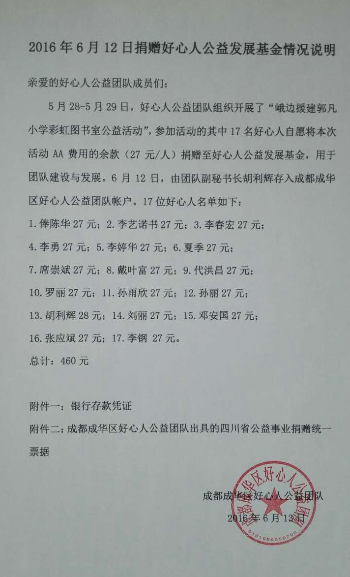 5月28-5月29日,好心人公益团队组织开展了“峨边援建郭凡小学彩虹图书室公益活动”,参加活动的其中17名好心人自愿将本次活动AA费用的余款(27元/人)捐赠至好心人公益发展基金,用于团队建设与发展。6月12日,由团队副秘书长胡利辉存入成都成华区好心人公益团队公帐户。17位好心人名单如下: