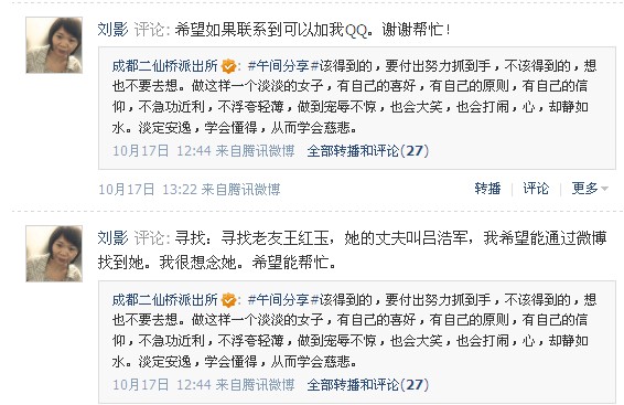 两个当年朝夕相处的朋友,17年内只联系上一次,后来因故中断联系。其中一个朋友四处联系无果后,前不久通过二仙桥派出所微博求助。派出所通过多方查询,昨日,终于为两人成功牵线搭桥。 1987年到1992年期间,来自绵阳的刘影和成都二仙桥的王红玉,一起在四川函授大学做内部管理。两人朝夕相处,无话不谈。1992年,刘影离开函大,回老家盐亭工作。大约在1994年,王红玉也离开了函大,从此二人便断了联系。多年来,刘影一直没有放弃寻找老朋友。她还专门让女儿在网上发帖、发微博帮忙打听消息。 据二仙桥派出所教导员李婷华介绍,他们在留意到微博上刘影的求助后,开始通过警方平台寻人,经过多方努力,昨日,李婷华和另一位民警来到双林路,在王红玉家里找到了她。 成都商报记者 辜波 实习记者 赵一丹 |