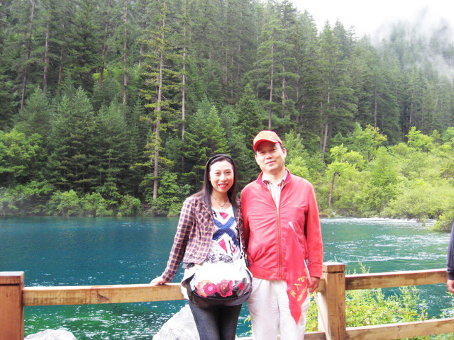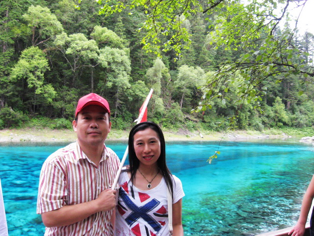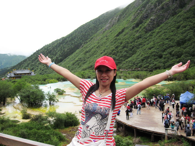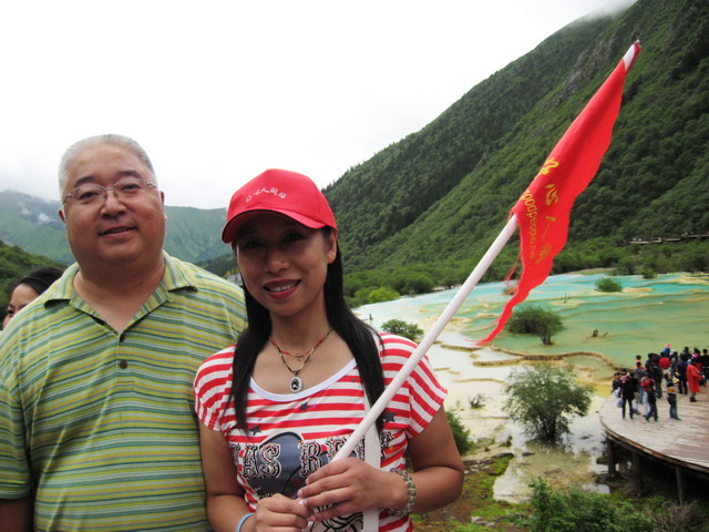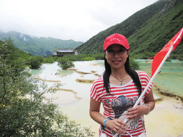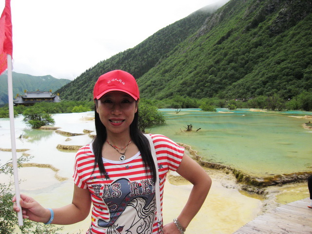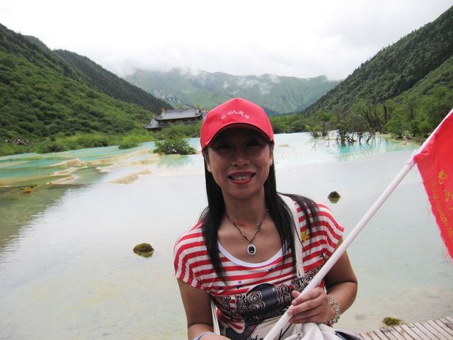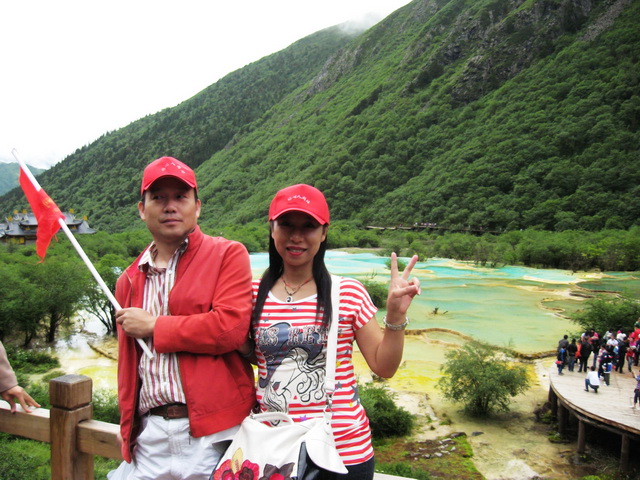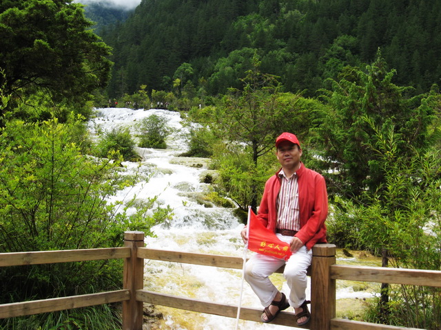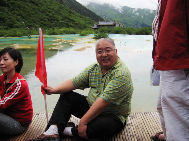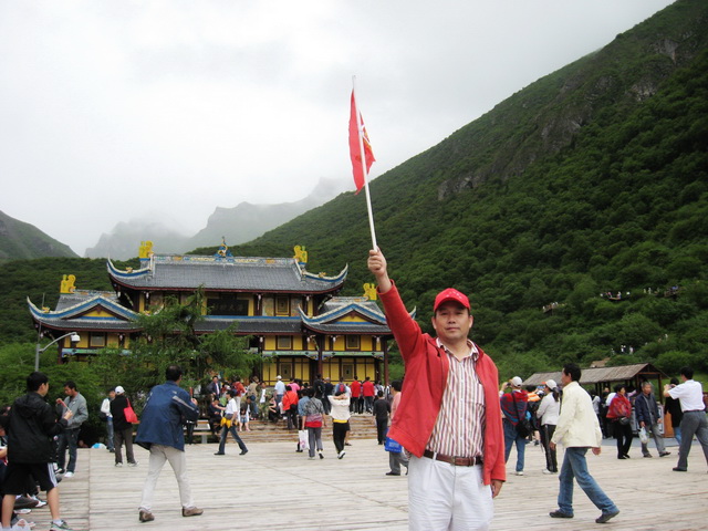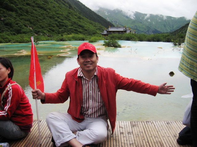 第二日早餐后,我们来到黄龙,在海拔4000米的高山上游黄龙,又是一种新的体验。导游告诫我们,每人最好是先饮用抗高原反应的保健药红景天,这是惯例,我调侃地对他二人讲,实践是检验真理的唯一标准,我们三人谁都不服用此保健药,看我们的身体能不能经得起检验,二人应声同意,意气风发地登上黄龙索道,高山索道与其它景区索道尤有区别,因高海拔的索道钢绳上下起伏浪得特别狠,是强劲山风所致,人坐在上面犹如坐在海轮上,窗外的山景是绿的植被,随着上行伴着阵阵雾霭,犹如神仙们在天上行走,片片祥云紧随,正如毛主席他老人家所说“可上九天揽月,可下五洋捉鳖”,的确,伸手仿佛可摘下片片祥云,舒心、兴奋交织着。约莫十多分钟光景,我们下得缆车,举目一望黄龙,哦,原来称之为黄龙的是在群山之间的峡谷中躺着一条甚是宽大的河水,顺着山势向下汩汩流淌着。由于上万年的冲刷,又因特别的地质结构,河床呈黄褐色,在河床的上面众多的树木花草蓬勃地生长着,远观整个黄龙依偎在翡翠般的山坡上,青山远映,碧水微澜,就象云南纳西族的梯田从高到低排列,一池池的河水倒映着蓝天白云,阳光中荡着青山,游人如织,流连忘返这湖光山色,日臻完善的旅游设施木栈道顺着峡谷沿山脚一字排开,正中的河床从上到下也排列着木栈道,供游人行走、休息、照像;和谐社会以人为本的春风吹进了城乡原野,我由衷赞叹,从操南腔北调的交谈中可想见此地的繁喧。踏着栈道小径曲直,赏着晨晖流苏,黄龙是那么美。这里碧波荡漾,水鸟飞翔,眼前所及青山绿水,天蓝蓝,水蓝蓝,青草依依,繁花锦簇,一种亲近自然的渴望,一种自然给予的满足,涤荡了尘世所有的烦恼,自然献上的大美,使天地人瞬间静止合一了。再远看黄龙美得炫目飘逸,近瞧美得绚丽斑斓,蝶飞蜂舞,暗香阵阵,鲜花盛开,黄的灿灿如金、粉的招摇似火,美仑美奂,使人震撼了,各种美丽词藻在这里苍白了,穷尽了。黄龙胜景五彩池也是五个玉盘似的水池,水是由靛蓝渐褪至青蓝,依次流淌着,正如荀子劝学中所说“青出于蓝胜于蓝”。水静得娇嫩,好似端庄、美丽、羞涩的五姐妹,放眼一望,在群山中的五个彩池犹如天上王母撒下的五颗珍珠,那么耀眼,那么夺目,那么醉人,黄龙正以她妩媚的美丽诱人,以及独特的地理环境吸引着八方宾客,说黄龙就要道黄龙寺,黄龙寺红砖碧瓦伫立于通往山里的独径上,与其说独径倒不如说是一条水道,一条溪流静静地流淌着,相传远古的黄龙是一条桀骜不驯的苍龙,时时搅动着山川,引发山洪,毁人良田房屋,后经燃灯古佛的点化,驯服后蛰服于此,镇守这里的一草一木,使其它劣龙不能兴风作浪。一方水土养一方人,这里的人尤以羌族居多,羌族是一个古老的民族,民风剽悍,热情好客,质朴,三国时的第二条好汉马超便是羌族。这里稀少的山民非常珍惜这上天所赐的恩惠,把这山这水打扮得如此艳丽多姿,让大山涵养的水份毫无保留地释放出来,柔情回馈,山林、草木,一个令人敬佩的天理轮回,这里是清凉的清凉界。