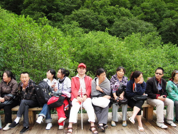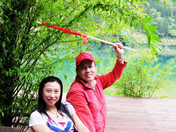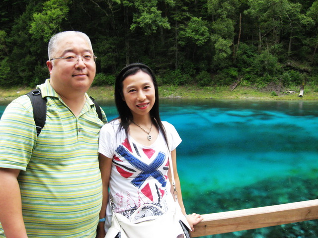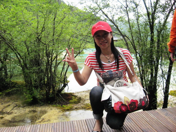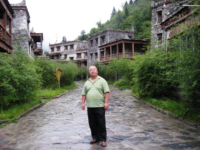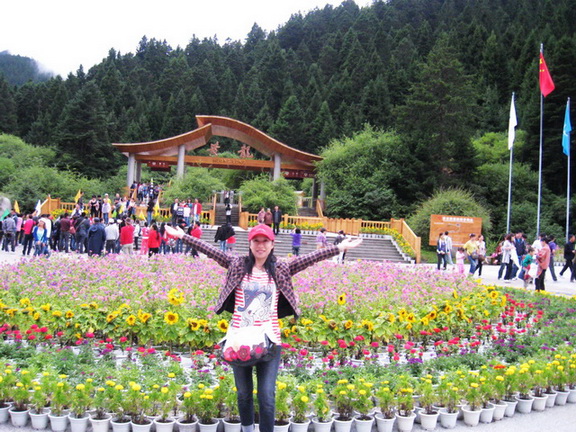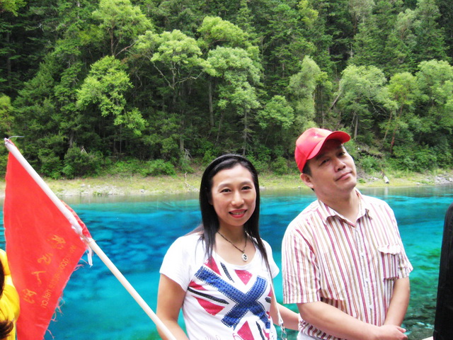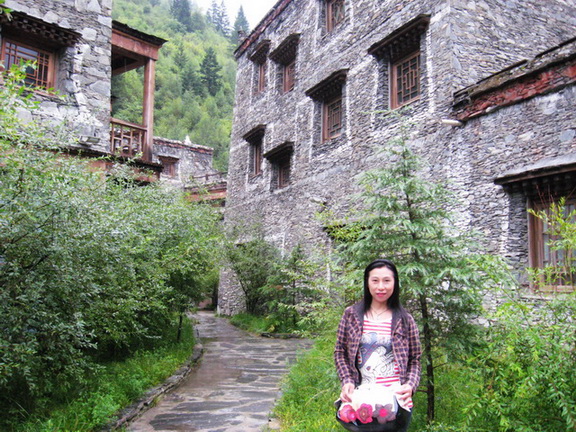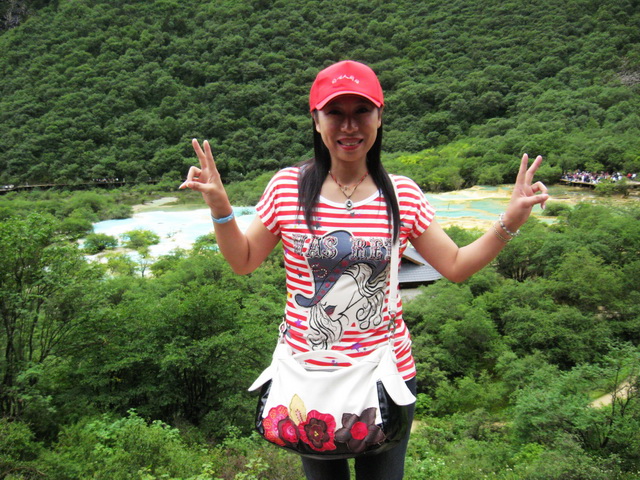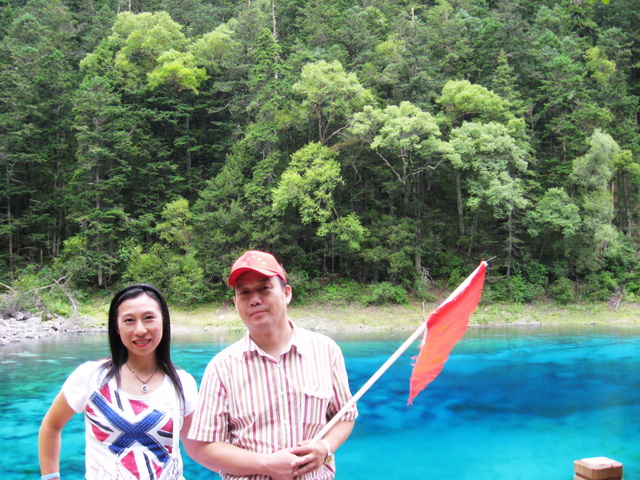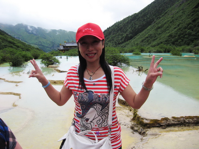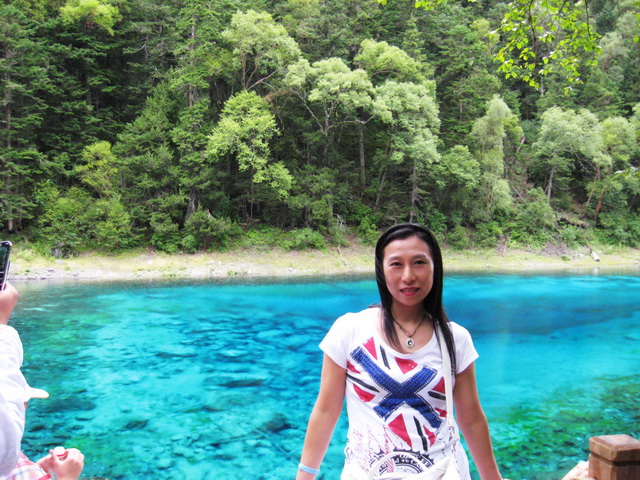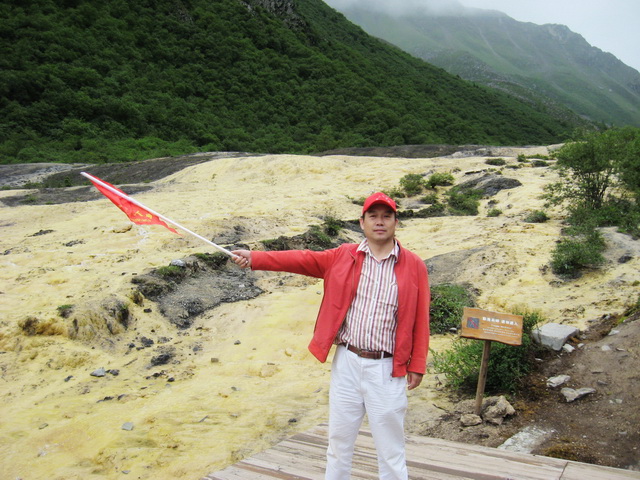 第二日早餐后,我们来到黄龙,在海拔4000米的高山上游黄龙,又是一种新的体验。导游告诫我们,每人最好是先饮用抗高原反应的保健药红景天,这是惯例,我调侃地对他二人讲,实践是检验真理的唯一标准,我们三人谁都不服用此保健药,看我们的身体能不能经得起检验,二人应声同意,意气风发地登上黄龙索道,高山索道与其它景区索道尤有区别,因高海拔的索道钢绳上下起伏浪得特别狠,是强劲山风所致,人坐在上面犹如坐在海轮上,窗外的山景是绿的植被,随着上行伴着阵阵雾霭,犹如神仙们在天上行走,片片祥云紧随,正如毛主席他老人家所说“可上九天揽月,可下五洋捉鳖”,的确,伸手仿佛可摘下片片祥云,舒心、兴奋交织着。约莫十多分钟光景,我们下得缆车,举目一望黄龙,哦,原来称之为黄龙的是在群山之间的峡谷中躺着一条甚是宽大的河水,顺着山势向下汩汩流淌着。由于上万年的冲刷,又因特别的地质结构,河床呈黄褐色,在河床的上面众多的树木花草蓬勃地生长着,远观整个黄龙依偎在翡翠般的山坡上,青山远映,碧水微澜,就象云南纳西族的梯田从高到低排列,一池池的河水倒映着蓝天白云,阳光中荡着青山,游人如织,流连忘返这湖光山色,日臻完善的旅游设施木栈道顺着峡谷沿山脚一字排开,正中的河床从上到下也排列着木栈道,供游人行走、休息、照像;和谐社会以人为本的春风吹进了城乡原野,我由衷赞叹,从操南腔北调的交谈中可想见此地的繁喧。踏着栈道小径曲直,赏着晨晖流苏,黄龙是那么美。这里碧波荡漾,水鸟飞翔,眼前所及青山绿水,天蓝蓝,水蓝蓝,青草依依,繁花锦簇,一种亲近自然的渴望,一种自然给予的满足,涤荡了尘世所有的烦恼,自然献上的大美,使天地人瞬间静止合一了。再远看黄龙美得炫目飘逸,近瞧美得绚丽斑斓,蝶飞蜂舞,暗香阵阵,鲜花盛开,黄的灿灿如金、粉的招摇似火,美仑美奂,使人震撼了,各种美丽词藻在这里苍白了,穷尽了。黄龙胜景五彩池也是五个玉盘似的水池,水是由靛蓝渐褪至青蓝,依次流淌着,正如荀子劝学中所说“青出于蓝胜于蓝”。水静得娇嫩,好似端庄、美丽、羞涩的五姐妹,放眼一望,在群山中的五个彩池犹如天上王母撒下的五颗珍珠,那么耀眼,那么夺目,那么醉人,黄龙正以她妩媚的美丽诱人,以及独特的地理环境吸引着八方宾客,说黄龙就要道黄龙寺,黄龙寺红砖碧瓦伫立于通往山里的独径上,与其说独径倒不如说是一条水道,一条溪流静静地流淌着,相传远古的黄龙是一条桀骜不驯的苍龙,时时搅动着山川,引发山洪,毁人良田房屋,后经燃灯古佛的点化,驯服后蛰服于此,镇守这里的一草一木,使其它劣龙不能兴风作浪。一方水土养一方人,这里的人尤以羌族居多,羌族是一个古老的民族,民风剽悍,热情好客,质朴,三国时的第二条好汉马超便是羌族。这里稀少的山民非常珍惜这上天所赐的恩惠,把这山这水打扮得如此艳丽多姿,让大山涵养的水份毫无保留地释放出来,柔情回馈,山林、草木,一个令人敬佩的天理轮回,这里是清凉的清凉界。