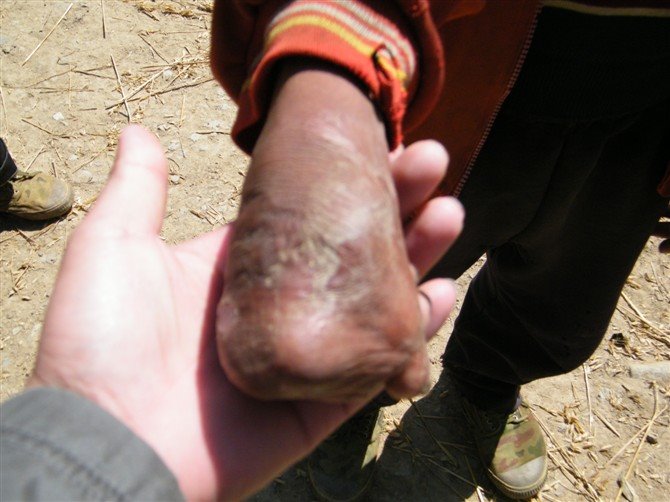 12岁的“阿约日提”现在在读小学二年级,他的右手小时候被火烧伤后由于没钱治疗,造成神经萎缩,现在已经残废。特别渴望知识,就用用左手写字,坚持学习,并取得不错的成绩。 |