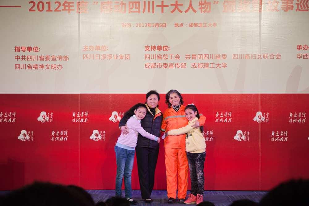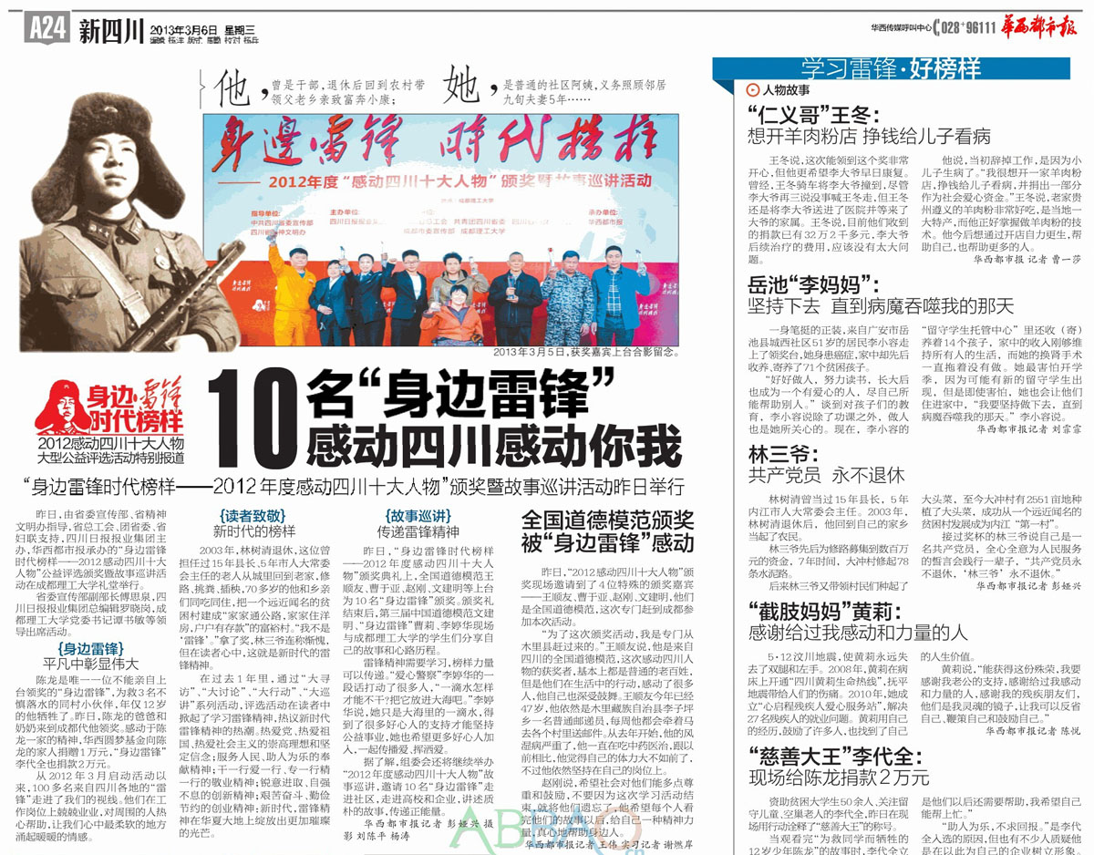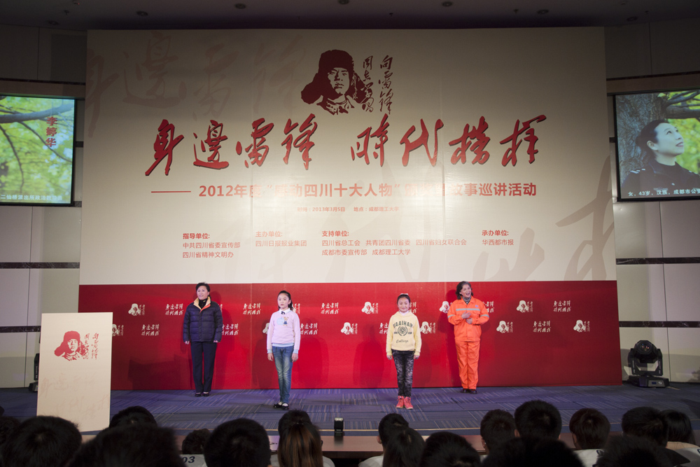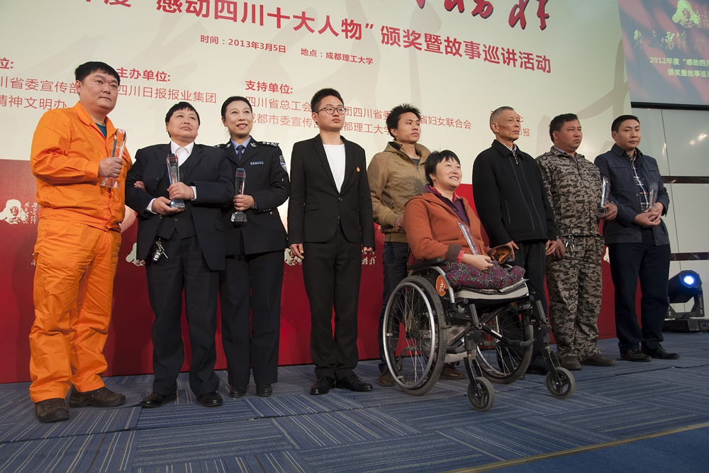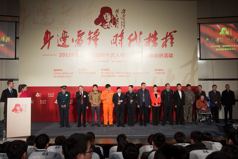 2012年3月,由四川省委宣传部、四川省精神文明办指导,四川省总工会、四川团省委、四川省妇联支持,四川日报报业集团主办、华西都市报承办的“身边雷锋 时代榜样——2012年度感动四川十大人物”评选活动拉开了序幕。此后一年多的时间里,全川21市州共推荐了130名候选人,超过50万人次参与投票。最终,组委会综合读者网友投票、人物事迹和专家评审意见,评选出10名“2012年度感动四川十大人物”。