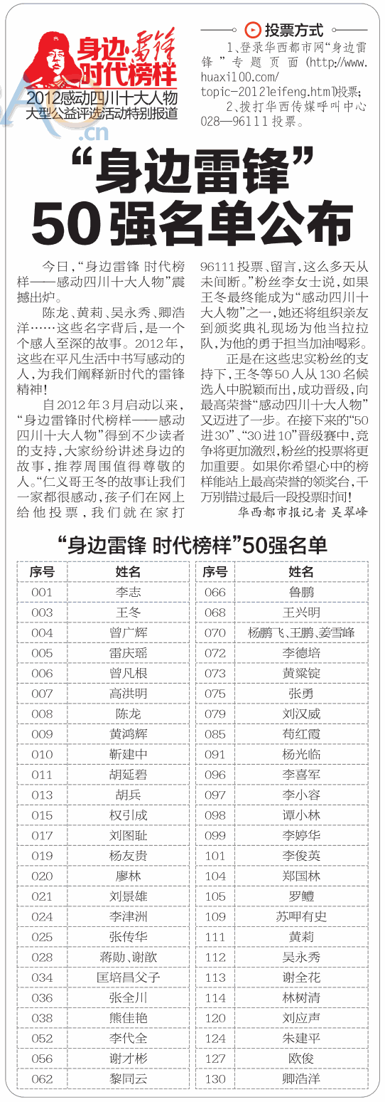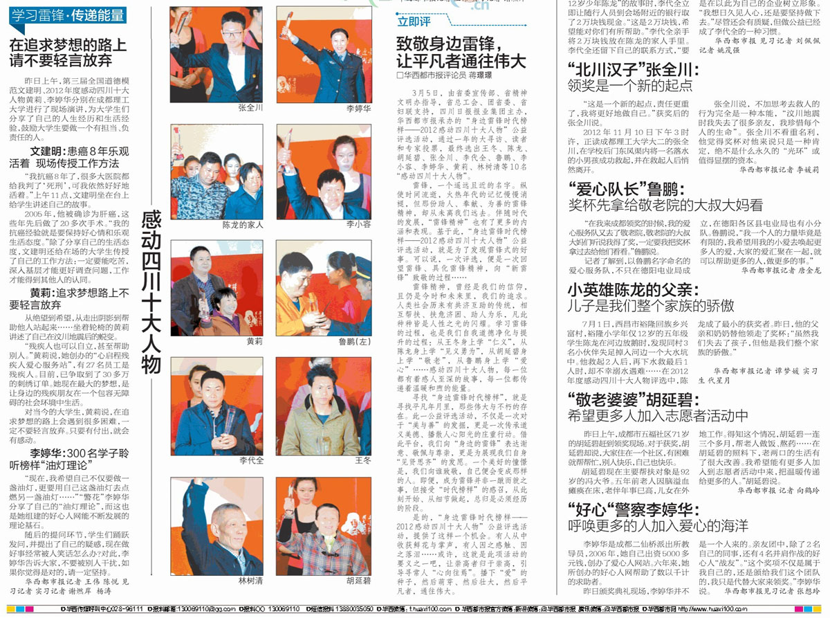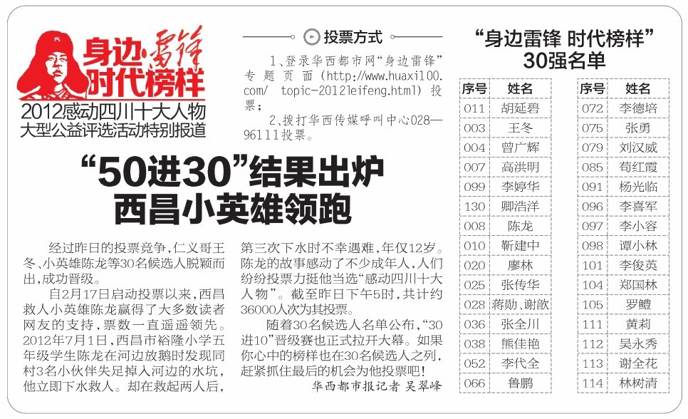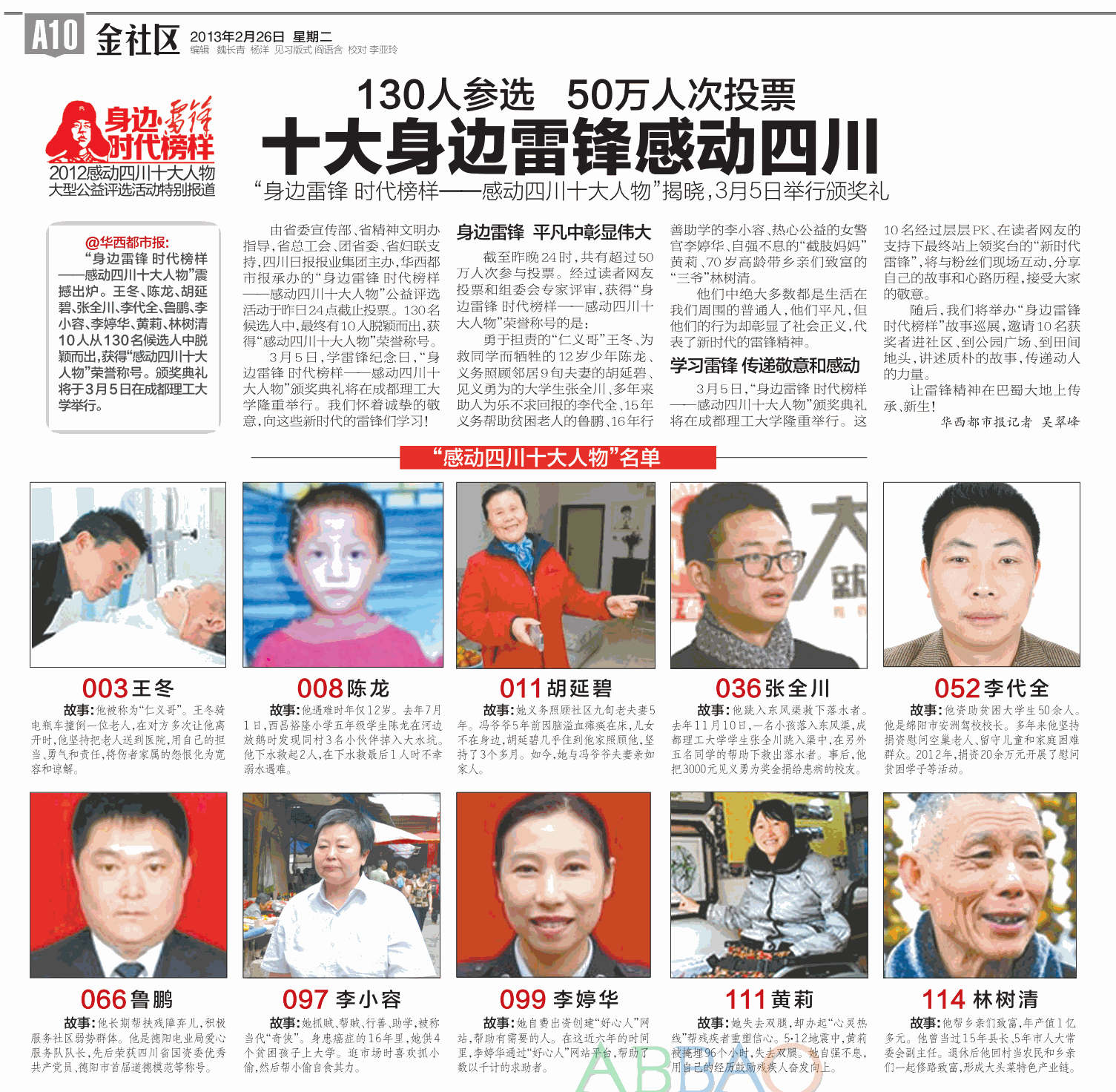 2012年3月,由四川省委宣传部、四川省精神文明办指导,四川省总工会、四川团省委、四川省妇联支持,四川日报报业集团主办、华西都市报承办的“身边雷锋 时代榜样——2012年度感动四川十大人物”评选活动拉开了序幕。此后一年多的时间里,全川21市州共推荐了130名候选人,超过50万人次参与投票。最终,组委会综合读者网友投票、人物事迹和专家评审意见,评选出10名“2012年度感动四川十大人物”。