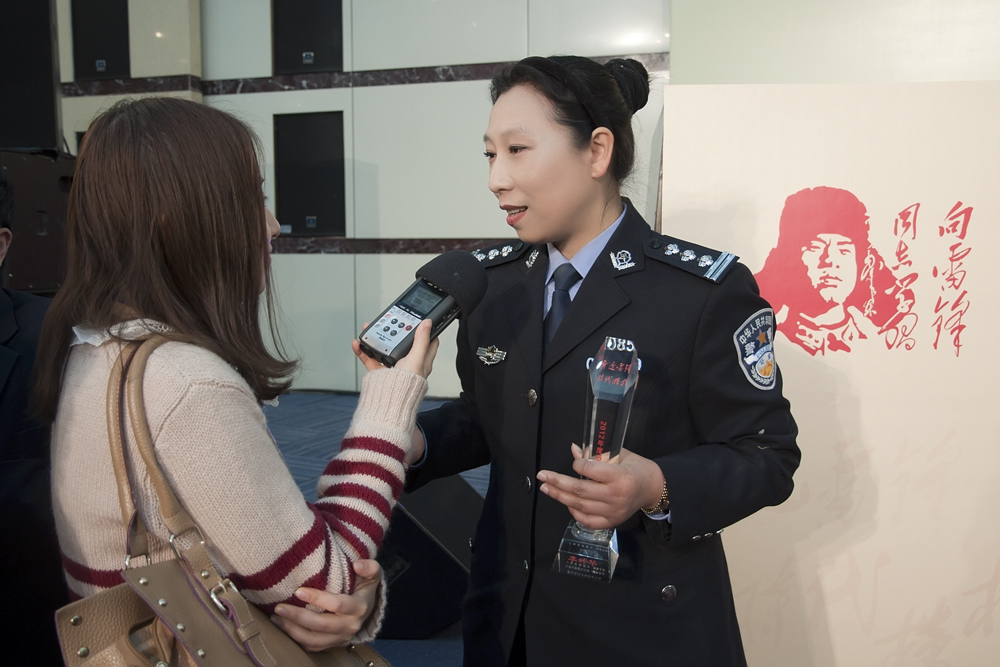 用实际行动传承雷锋精神的人物站在一起,下面快门声不断。