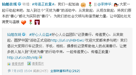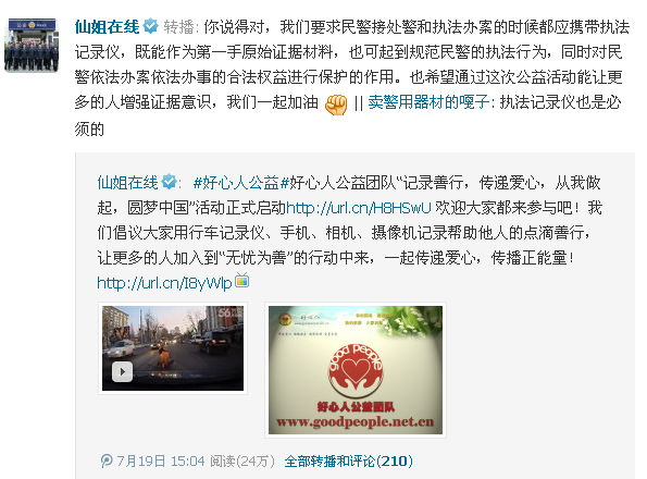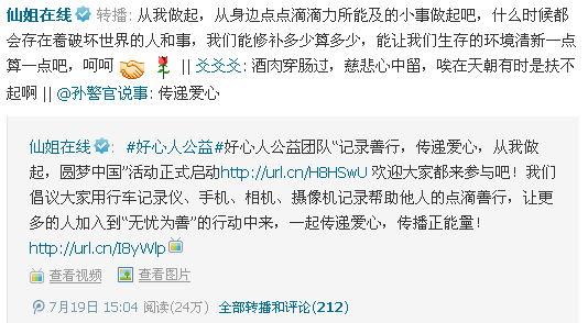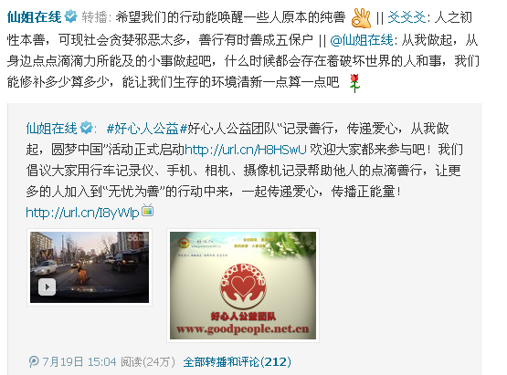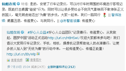 活动形式延伸:只要是能够记录善行,传递爱心,弘扬良好的道德风尚,除了以上采用行车记录仪记录善行的形式,好心人团队成员也可使用手机、相机、摄像机等设备,随时发现、随手捕捉,记录下任何所见的感人瞬间,交由好心人公益团队活动领导小组,做好资料收集,最后制成感人视频。