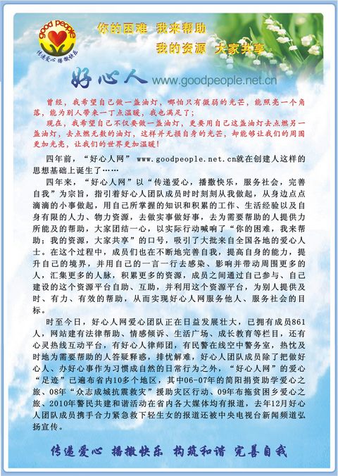 四年前,“好心人网” www.goodpeople.net.cn就在创建人这样的思想基础上诞生了……
