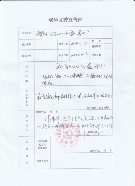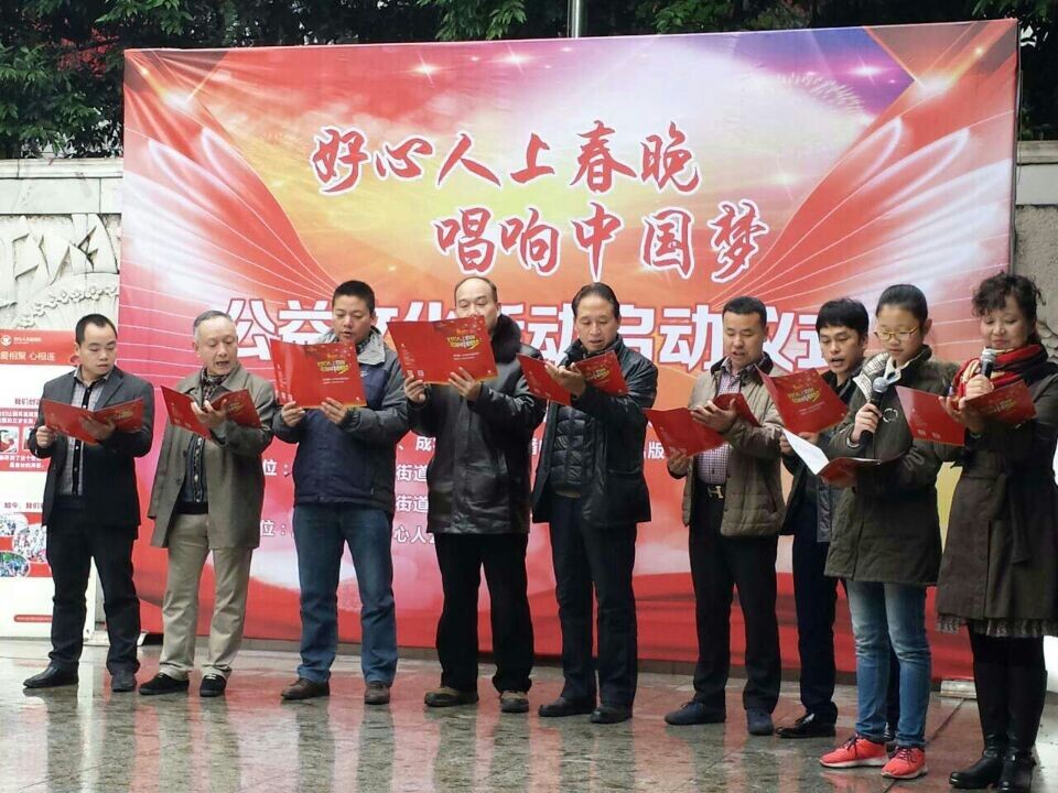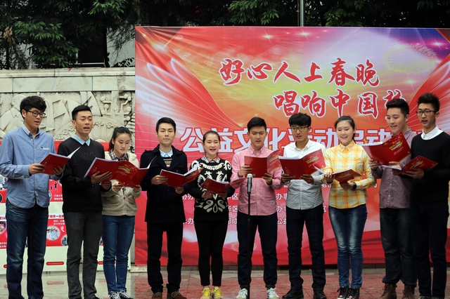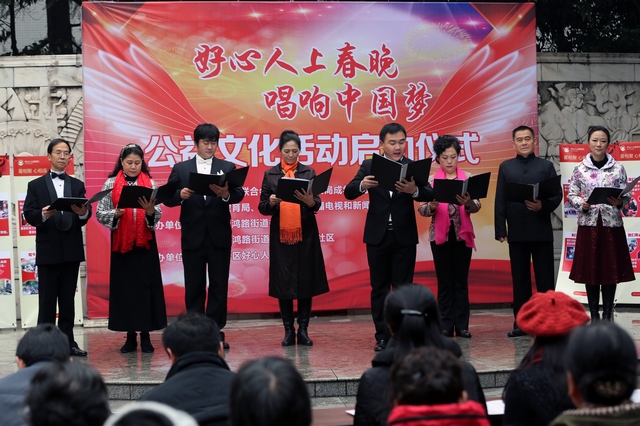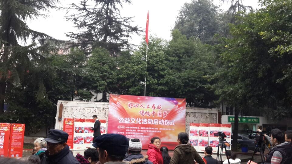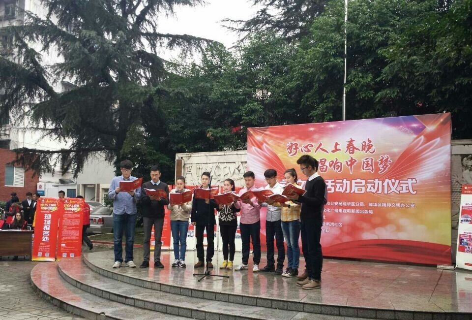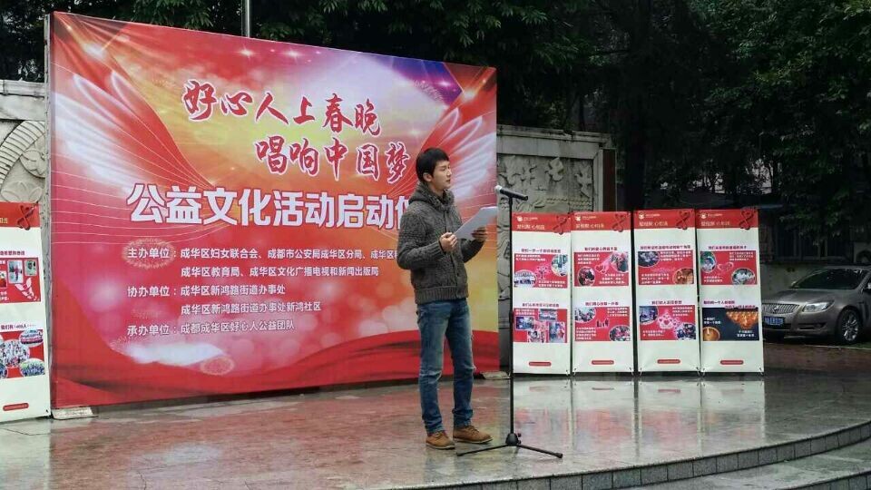 1、启动:12月6日上午10点,由成华区妇女联合会、成都市公安局成华区分局、成华区精神文明办公室、成华区教育局、成华区文化广播电视和新闻出版局联合主办,成华区新鸿路街道办事处新鸿社区协办,由好心人公益团队承办,在成华区新鸿路街道办事处新鸿社区举行“好心人上春晚”活动海选启动仪式,好心人公益团队预先排练4组中国梦朗诵节目,于该项启动仪式上献演,并发出“成华区好心人上春晚海选公告”,现场启动海选报名,同时将在“好心人网”和好心人公益微信公众平台发布公告,并接受网络报名。报名截止时间为12月10日。