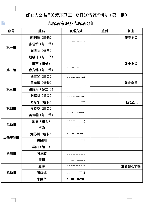 4、后勤组组长:专员刘丽 138 8199 1881——负责志愿者招募、物资准备;