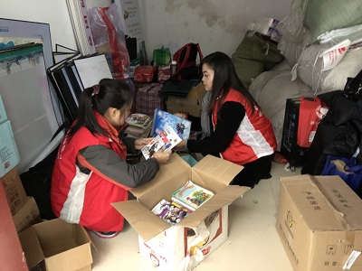 12月14日,上午10点团队秘书长刘苏川,成员田大哥、彭菲、小黄燕一起到达库房去整理爱心捐赠物资,先把书的内容看看适合这次观塘村小朋友看的书就整理到箱子里,然后将被子整理好放入袋子,最后将整理的好的物资搬运到办公室。