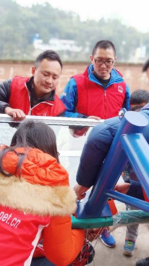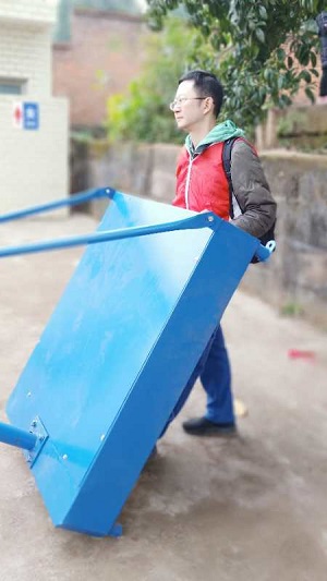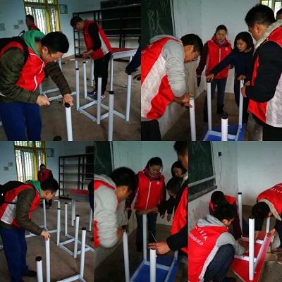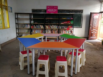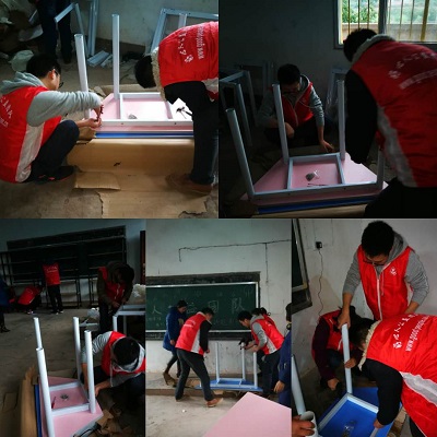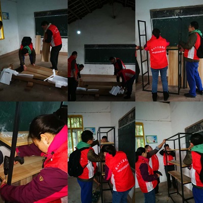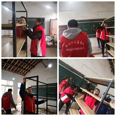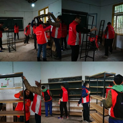 在学校的二楼上志愿者们又开始拼装书架和彩虹书桌: