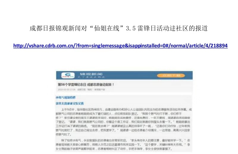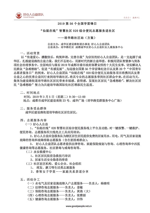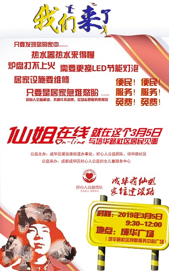 以“传递爱心,播撒快乐,构筑和谐,完善自我”为宗旨的好心人公益团队,是一支起源于成华区、扎根建设路的公益力量,我们不忘初心,用新时代的新公益举措,积极用团队智慧参与到各项社会治理事务中,全面响应与落实2019年成都市委市政府部署安排的十大民生实事,切实解决人民群众“急难愁盼”,促进“有感发展”,为迎接全国第56个学雷锋纪念日以及第20个“中国青年志愿者服务日”的到来,好心人公益团队将“仙姐在线”O2O综合便民互助服务项目带到社区,从线上走到线下,与群众零距离接触,用我们专业的志愿服务项目为建设路街道培华路社区居民带来幸福感、获得感,努力为共建培华路国际化社区增添民生温度。