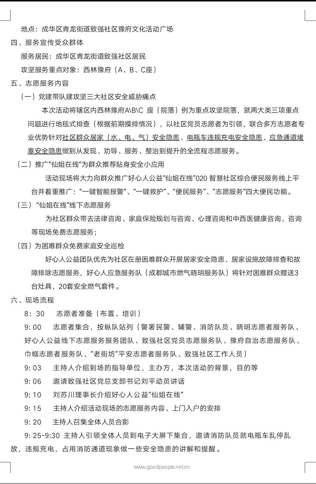 为贯彻与响应市委市府部署开展的“平安社区工程百日攻坚行动”精神,聚焦群众最关心、反映最强烈的问题,全面排查整治影响平安社区建设的突出问题和风险隐患,提升城乡社区治理体系和治理能力现代化,提升居民的获得感、幸福感、安全感,将问题发现在社区,排除出社区。在此,好心人公益团队“仙姐在线”O2O综合便民服务项目受邀即将走进成华区青龙街道致强社区,届时“仙姐在线”专业的居家排险志愿服务和特色线下便民志愿服务队伍将与致强社区党员志愿者服务队并肩携手,在辖区警方与消防中队的协同和支持下,重点围绕百日攻坚行动中9类29项排查清单中的社区群众居家(水、电、气)安全、电瓶车违规充电、应急通道堵塞等两大类三项突出问题进行志愿攻坚服务。