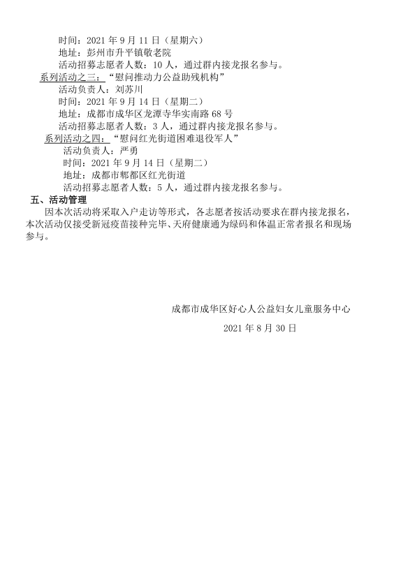 因本次活动将采取入户走访等形式,各志愿者按活动要求在群内接龙报名,本次活动仅接受新冠疫苗接种完毕、天府健康通为绿码和体温正常者报名和现场参与。