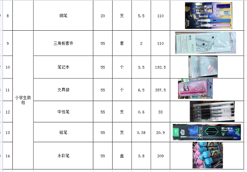 1、购买学校公共设施物资、学生助包学习用具,费用共计2828.90元;