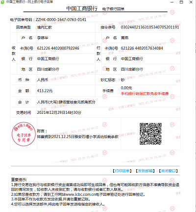 好心人团队工作人员小黄燕通过工商银行网上银行将本次活动剩余爱心捐款:413.22元,转捐到好心人公益援助基金账号,详情如下: