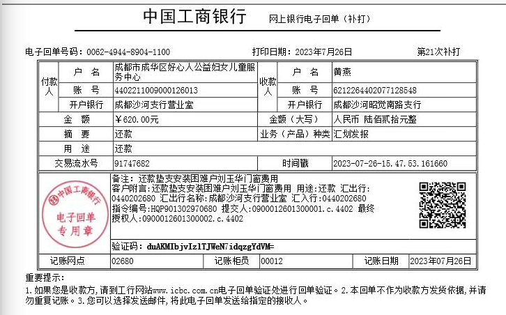 2023年7月26日,现从援助基金账户对工作人员小黄燕进行还款620元: |
