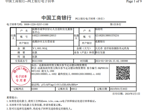以上物资均是杨晓明垫支购买,现从好心人援助基金账户进行还款,如下: