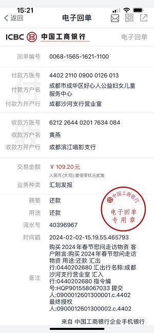 小黄燕垫支购买春联物资,计109.20元,现从好心人援助基金账户进行还款,如下: