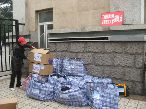 10月18日:成都理工大学捐赠现场,爱心汹涌,场面感人,摘一段19日成都商报的报道:昨日上午,在成都理工大学门口,几张桌椅一搭,就变成了一个小小的捐赠现场,一条写有“好心人网站2009布拖爱心之旅”的横幅悬挂其上。现场虽然简陋,却挡不住市民的爱心汹涌。上午11时,两个女孩费力地拖着一个大大的编织口袋来到捐助点。女孩说,她们是应届毕业生,一大早看到捐赠现场,就赶紧回去收拾衣服送了过来。而很多市民都是开着车过来送衣服。而好心人网站的工作人员则在紧张地忙碌着:将市民捐来的衣服分门别类,被子、棉衣、夏衣……分别用编织袋打包,再做好登记。详细内容http://news.sina.com.cn/s/2009-10-19/050816459347s.shtml