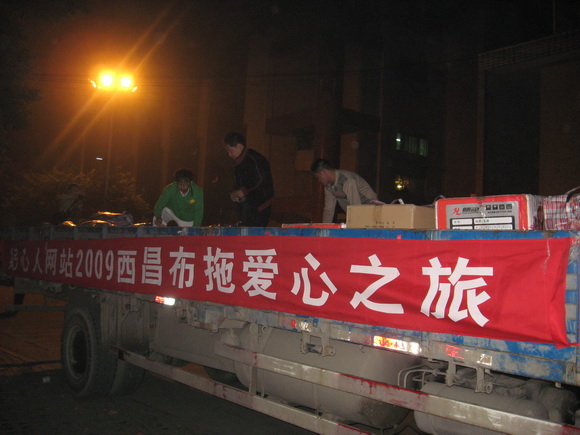 10月23日:一切都按照原计划顺利进行着,成都理工大学志愿者协会接过爱心接力棒协助好心人网站举行的布拖爱心之旅集中募捐活动于当天下午17点圆满结束,与此同时,好心人网站2009布拖爱心之旅募集的所有捐赠物品经过整理打包共计170件辗转犀浦、成都理工大学、二仙桥派出所装车后于晚上21点半顺利启程了!